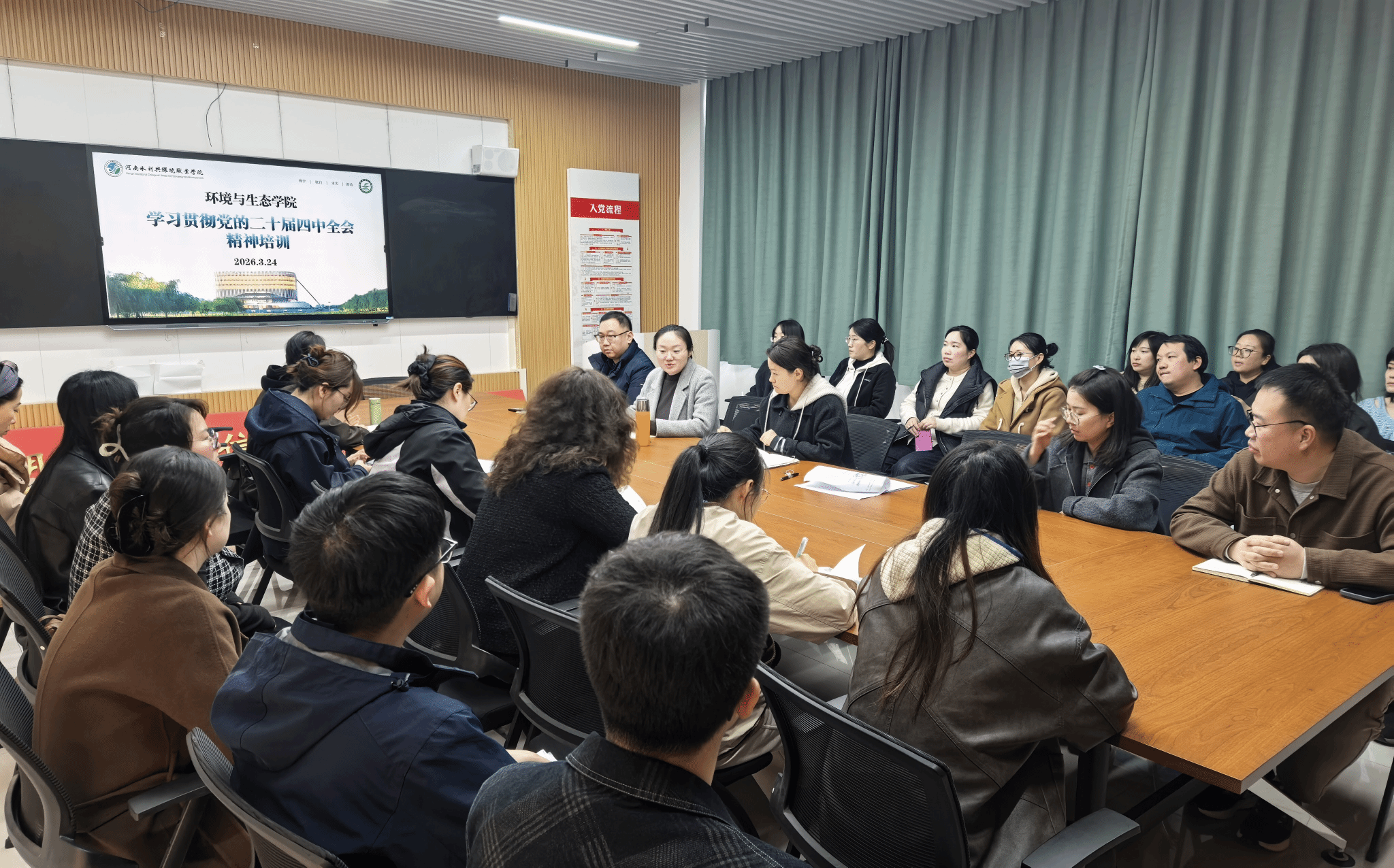 为深入贯彻落实党中央决策部署和校党委工作要求,3月24日下午,环境与生态学院在笃行楼205会议室召开专题学习会,开展科级以下干部、党员学习贯彻党的二十届四中全会精神培训。学院党总支书记邢伟明主持会议并领学,全体科级以下干部、党员参加学习。会上,邢伟明传达了校党委培训通知要求,带领大家研读文件内容。她强调,学习贯彻党的二十届四中全会精神是当前一项重要政治任务,全体干部、党员要切实提高思想认识,不断增强学习的政治自觉、...