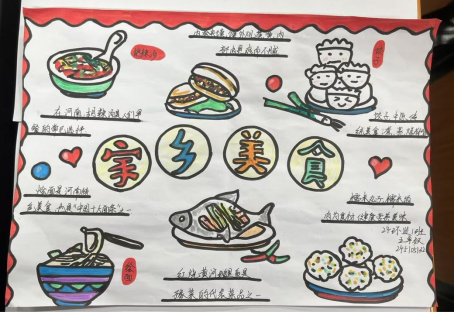 活动现场,伴随悠扬音乐,同学们拿起画笔,通过线条与色彩,与家乡美食进行一场特别“对话”。同学们一边展示绘画技巧,一边交流家乡美食特色及地域文化。擅长工笔画的同学,细致勾勒出家乡小吃纹理;善用色彩的同学,多层次描绘出对家乡美食的眷恋。这些精美的手抄报,浓缩家乡美食文化,既展现个人才华,也为家乡美食“代言”,传播地域美食魅力。