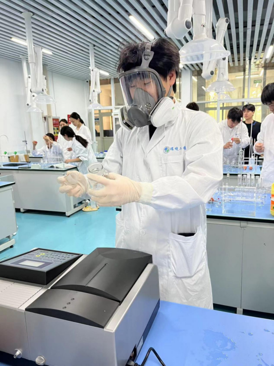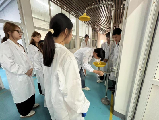 演练内容聚焦两个场景:一是化学试剂不慎进入眼睛的应急处理,二是化学试剂遗撒的紧急处置。在模拟化学试剂进入眼睛的场景中,学生迅速来到洗眼器处用大量清水冲洗眼睛,并及时请同学报告老师。老师迅速启动应急预案,确保学生得到及时的救治;在模拟化学试剂遗撒的场景中,学生严格按照实验室规定的应急处置流程,穿戴好防护设备、使用专用工具收集遗撒试剂,并用清洁剂清洗地面。整个过程中,实验员现场指导,确保处置过程安全规范。