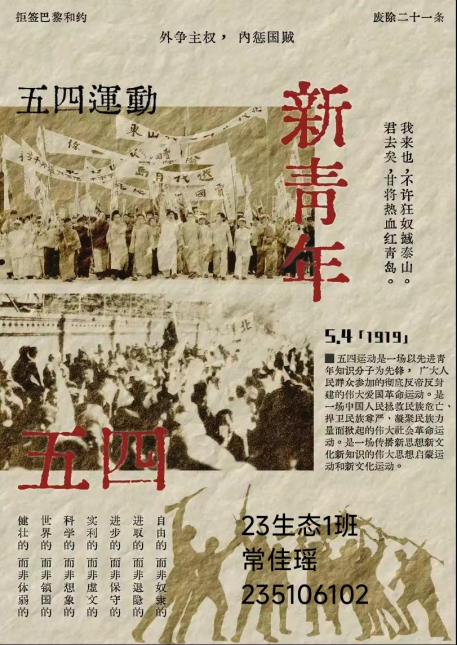 为使学生更好地了解五四运动的背景和意义,培养学生爱国主义情怀,5月5日—18日,太阳成集团tyc9728开展“弘扬五四精神,传承红色基因”手抄报及海报设计活动。