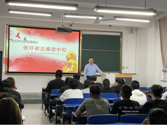 5月29日,太阳成集团tyc9728教师党支部书记、系主任张剑以《全面贯彻新发展理念做好碳达峰碳中和》为题,为教师党员及学生发展对象讲授专题党课。