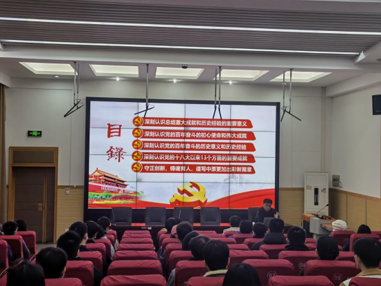 张凌杰围绕党的十九届六中全会审议通过的《中共中央关于党的百年奋斗重大成就和历史经验的决议》,运用翔实丰富的历史资料,深刻讲解了“总结重大成就和历史经验的重要意义”、“党的百年奋斗的初心使命和伟大成就”、“党的百年奋斗重大成就和历史经验”、“党的十八大以来13个方面的重要成就”等重要内容。他强调,中国共产党百年奋斗的光辉历史彰显了中国共产党的伟大精神,具有重大的历史意义。新时代青年大学生务必要学好党史、铭记党史,用党的创新理论武装头脑、指导实践,继承和发扬以爱国主义为核心的民族精神和以改革创新为核心的时代精神,以昂扬向上的精神面貌积极投入到第二个百年奋斗目标的新征程中去。