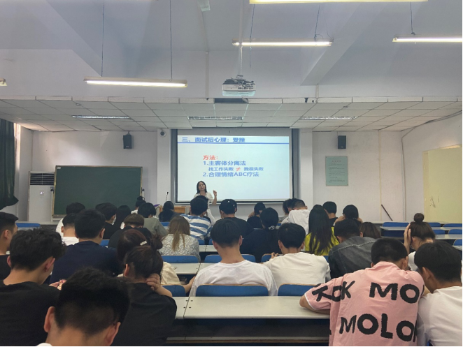 本次培训涵盖“简历制作技巧”、“面试心理学”、“面试礼仪”三个主题。王慧娟老师主讲了简历制作及面试技巧。她强调,内容简明扼要、求职意向清晰、排版格式规范是一份优秀简历的基础;潘春梅老师从心理学的角度,针对学生就业中的迷茫问题给出了建议,并指导学生学会应用情绪“ABC理论”解决就业中的遇到的困难;宁波老师结合自身经验,从面试语言、妆容仪表、行为举止、礼貌礼节等方面对面试礼仪进行了全面讲解。