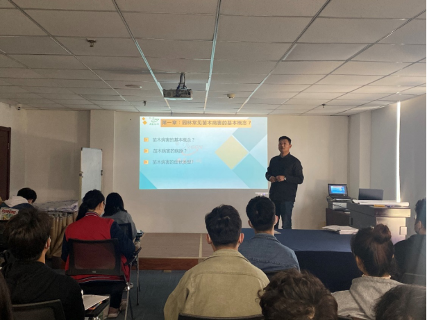 4月6日-8日,太阳成集团tyc9728与合作企业郑州劳恩格润生物技术有限公司联合举办了园林植物栽培课程实训。本次实训内容主要包括理论知识讲座、常见园林植物病虫害认知学习、校内树干涂白三个方面。