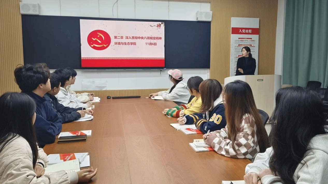 11月6日下午,环境与生态学院在笃行楼205教室开展第九期党的理论知识学习班专题授课,主题为“中央八项规定精神”,王旭萍老师担任主讲人,2025年9月入党积极分子参加,旨在引导全体学员深刻领会中央八项规定精神的核心要义,筑牢作风建设思想防线。
