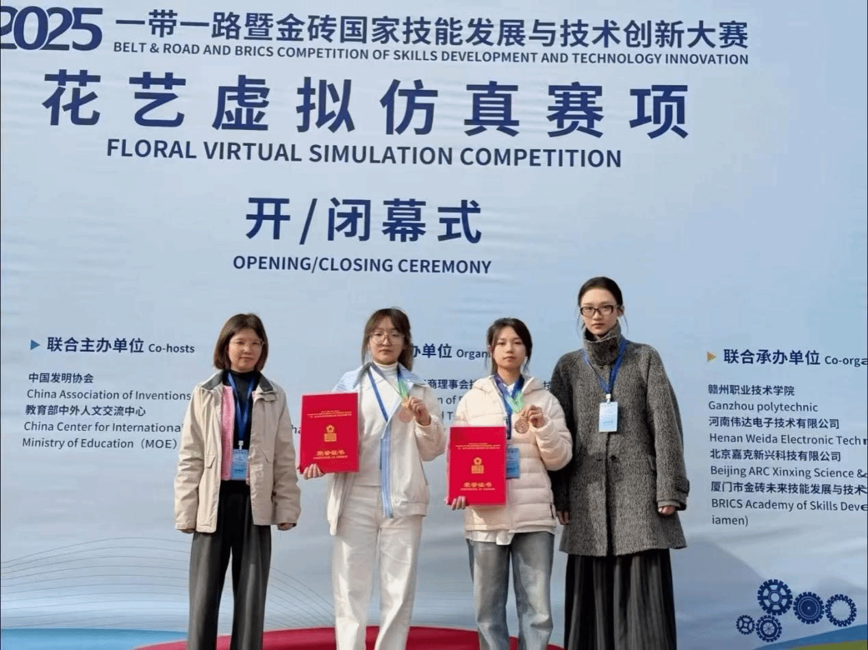 11月21日至23日,2025“一带一路”暨金砖国家技能发展与技术创新大赛国内决赛花艺虚拟仿真技能赛项在赣州职业技术学院举办。共有来自全国100多支队伍参赛,经过激烈角逐,我校环境与生态学院参赛队喜获铜牌。