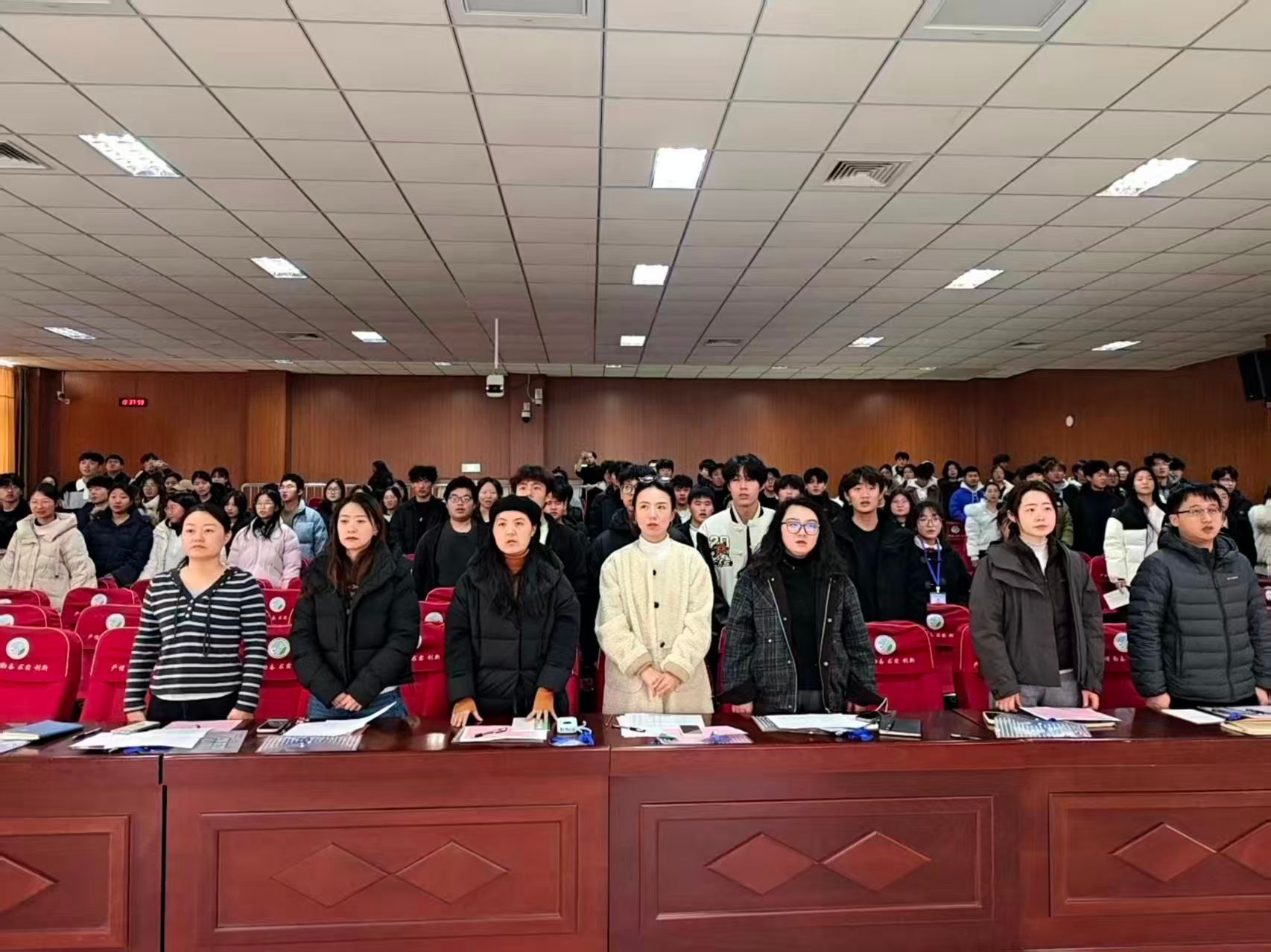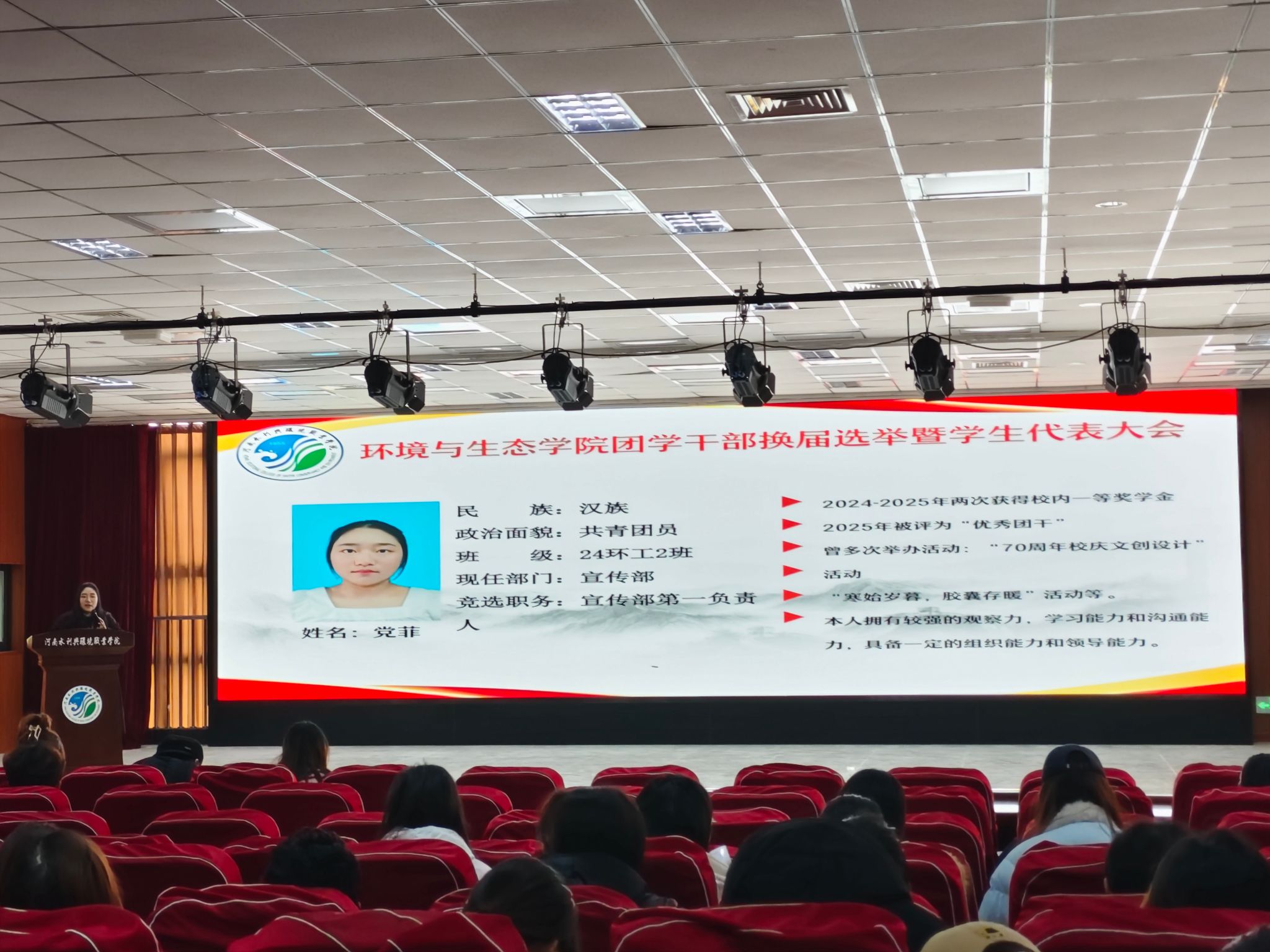 为加强团学组织建设,推进学生工作有序传承,12月9日,环境与生态学院“第五届团学干部换届选举暨学生代表大会”在德礼讲堂二楼隆重召开。学院党总支书记邢伟明、党总支副书记何欢、学生群团办公室主任王慧娟及各辅导员出席会议,全院120名学生代表参会,共同见证团学组织的新老交替与使命传承。大会在庄严的国歌声中正式拉开帷幕。