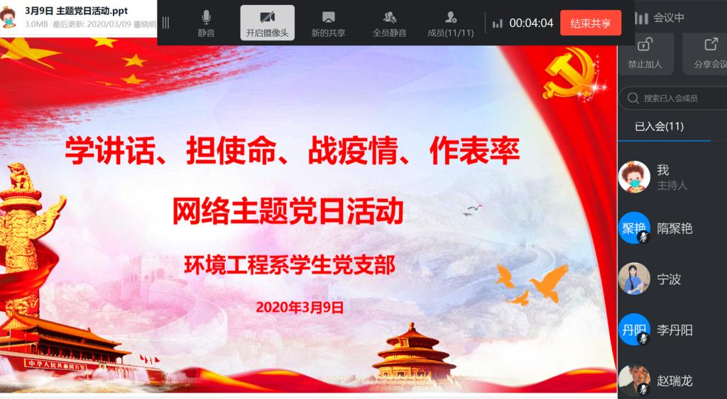 3月9日下午,太阳成集团tyc9728学生党支部采用钉钉直播形式组织开展“学讲话、担使命、战疫情、作表率”主题党日教育学习活动。活动由支部书记董晓明主持,学生党支部全体党员参加。