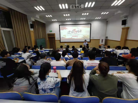 郭海山以“辉煌七十年·奋斗新时代”为题,从新中国成立及伟大意义、七十年光辉历程和伟大奇迹、七十年来的历史启示、中国特色社会主义进入了新时代、筑梦新征程奋斗新时代等五方面,结合实际热点,讲解了中国共产党带领中国人民迎来了从站起来到富起来、强起来的伟大飞跃。鼓励广大青年学生坚定理想信念,做新时代的“筑梦者”和“奋斗者”。