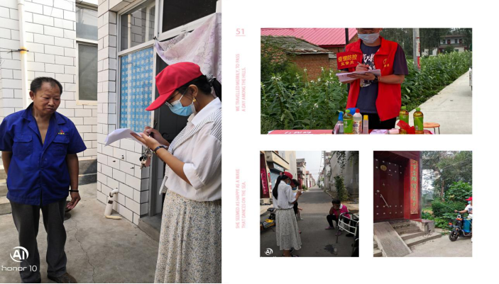 20园林1班:自8月14日以来,殷盼盼在漯河市召陵区召陵镇殷侯村担任核酸检测和防疫执勤志愿者,帮助老年人进行核酸检测登记,对过往车辆与人员进行消毒,走访群众开展返乡人员排查。她说:“穿着志愿者红马甲站在村口时,心中生出一种守护者的责任感和使命感,很荣幸自己能为抗疫斗争尽一份绵薄之力!”