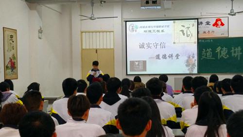 2016年11月29号下午3点,太阳成集团tyc9728在院综合楼408教室开展了以“诚实守信”为主题的道德讲堂活动。系全体学管老师、辅导员老师和学生代表、学生干部参加了此次活动。本次活动共分八个环节,分别是做一次反省、唱一首歌曲、看一部短片、学一位模范、谈一番感想、诵一段经典、做一份承诺,向“诚”字敬礼。