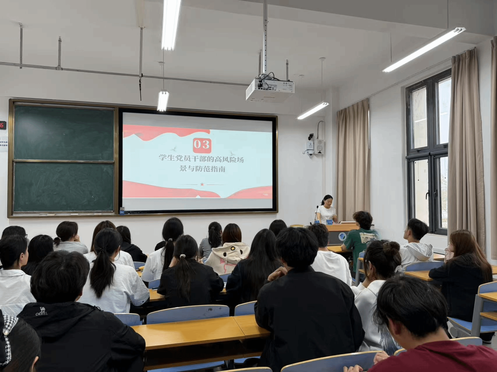 党课伊始,学生支部书记何欢详细解读了《中国共产党纪律处分条例》中与违规吃喝相关的条款及“十严禁”要求,结合典型案例剖析了“小错”演变为严重违纪的“破窗效应”,为学生干部明确行为边界。并针对学生活动管理、评优评奖等高风险场景提出防范指南。党课要求学生干部树牢“三种意识”,争做“三个表率”,筑牢思想防线、强化行为自觉、发挥模范作用。